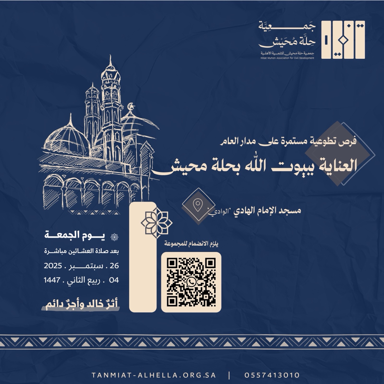ندعوكم للانضمام إلى حملة شبابية مباركة للعناية ببيوت الله ونيل الأجر العظيم.