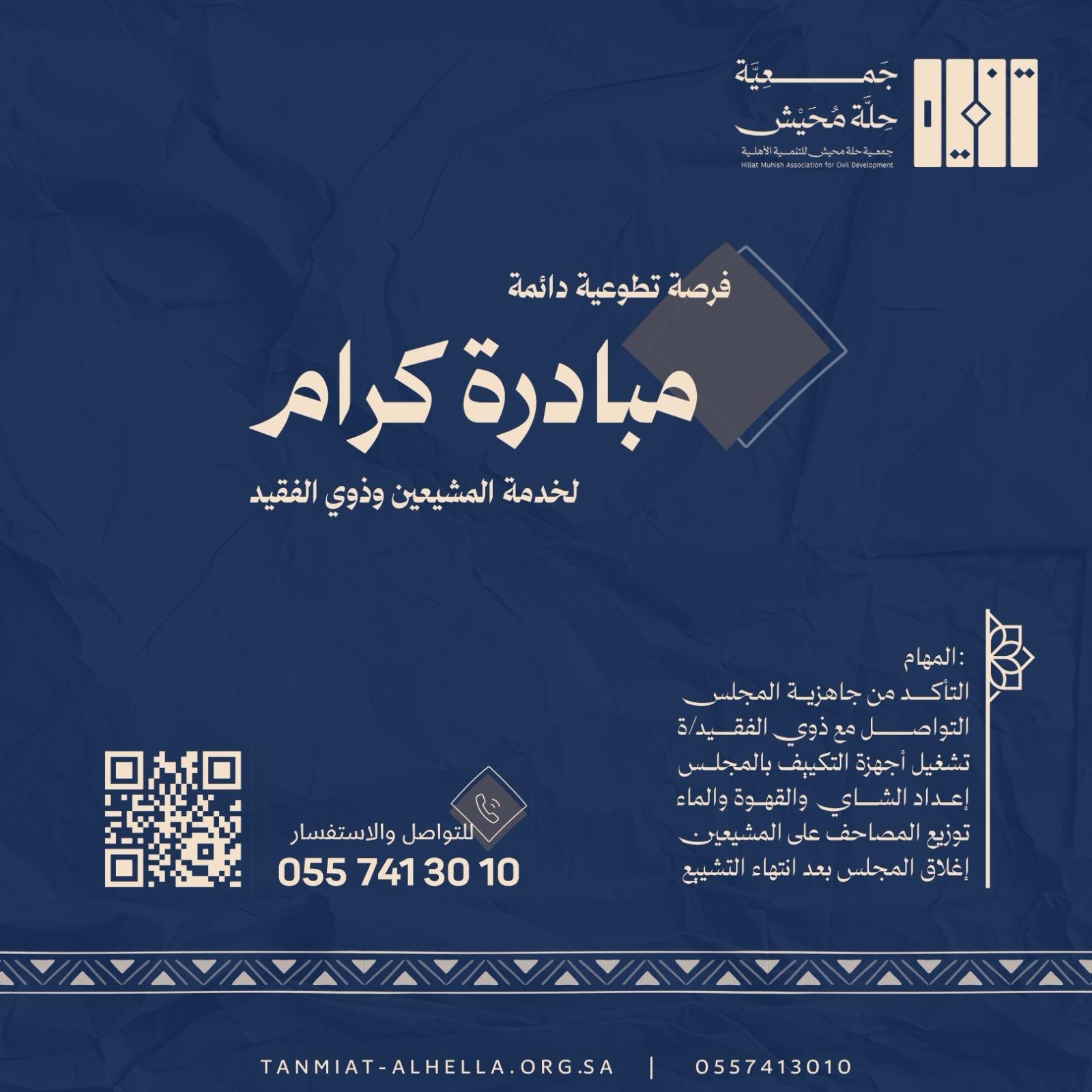 تعلن جمعية حلة محيش للتنمية الأهلية عن عن فرصة تطوعية دائمة لخدمة المشيعين وذوي المتوفى ضمن مبادرة كرام.