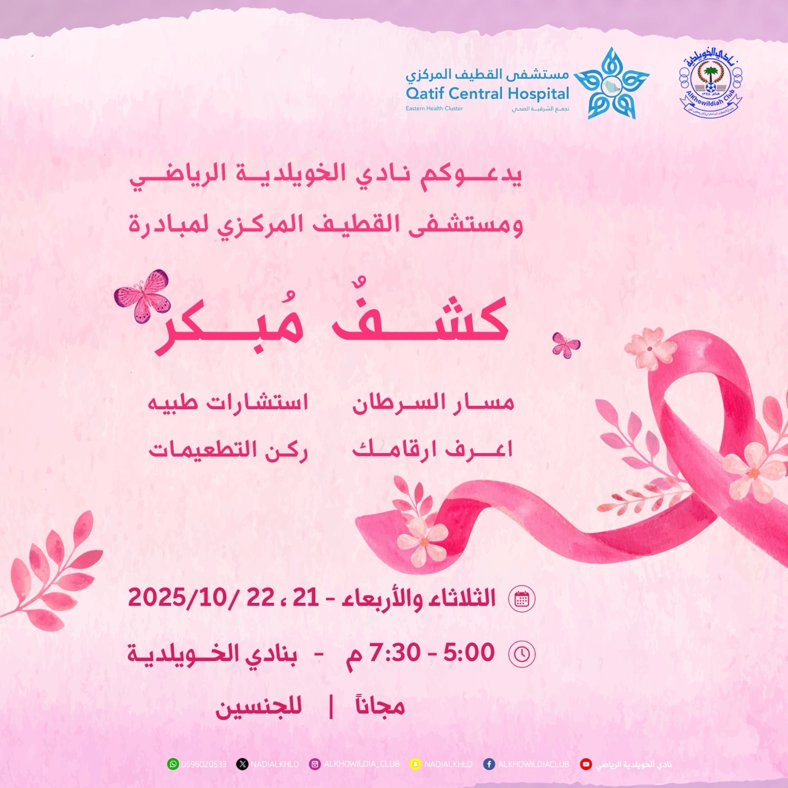 نادي الخويلدية الرياضي بالتعاون مع **مستشفى القطيف المركزي** يدعوكم لحضور مبادرة **كشف مبكر** للكشف عن السرطان 💕