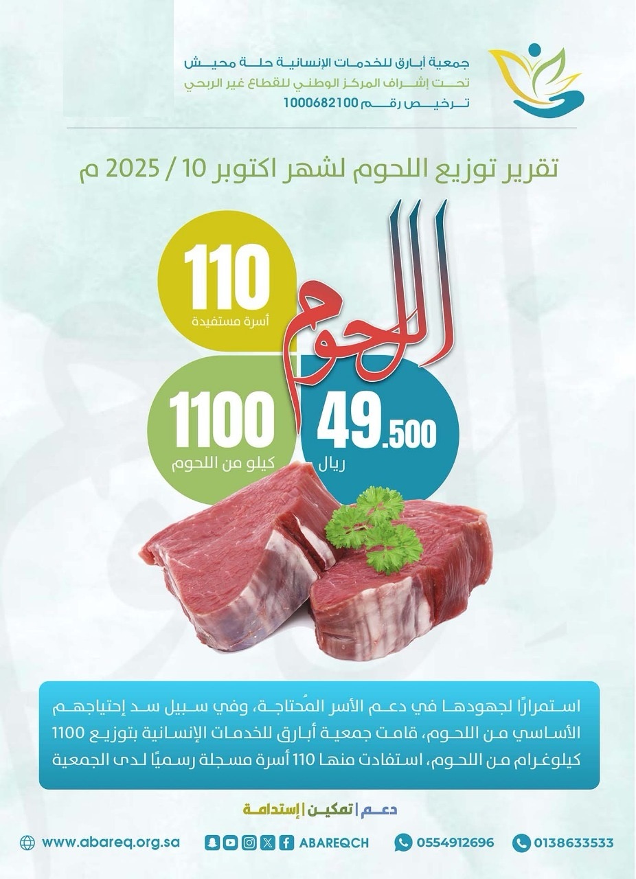 استمرارًا لجهودها في دعم الأسر المحتاجة، وفي سبيل سد احتياجهم الأساسي من اللحوم، قامت جمعية أبارق للخدمات الإنسانية بتوزيع 1100 كيلوغرام من اللحوم، استفادت منها 110 أسر مسجلة رسميًا لدى الجمعية .