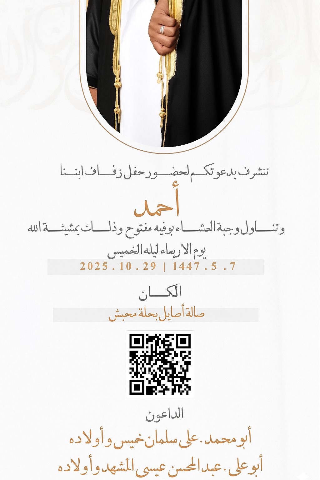 نتشرف بدعوتكم لحضور حفل زفاف إبننا يوم الأربعاء ليلة الخميس
