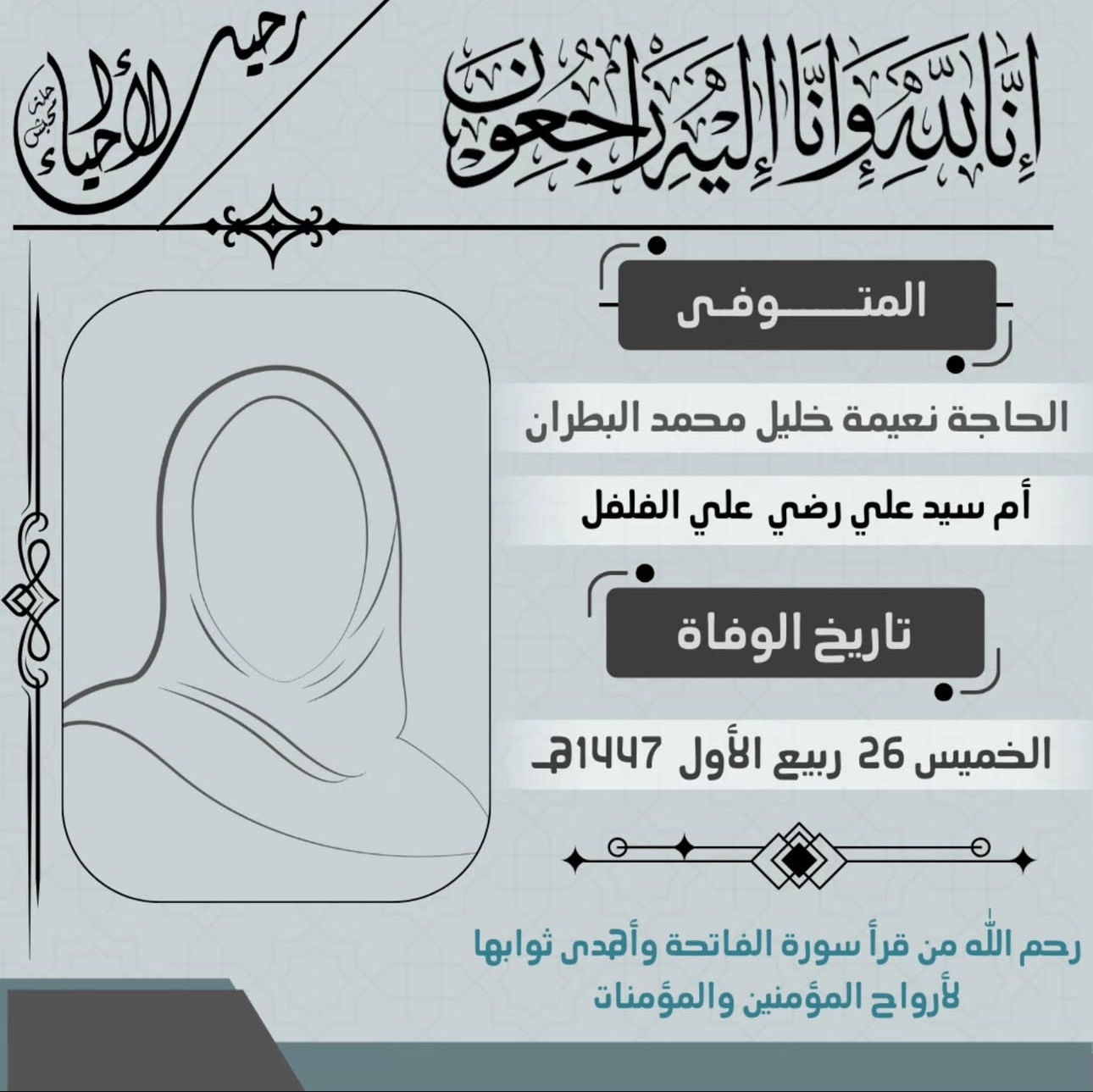 أربعينية المرحومة الحاجة نعيمة خليل البطران أم سيد علي الفلفل