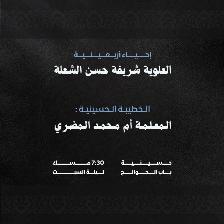 الرئيسية/راحلون/للنساء : أربعينية الحاجة شريفة سيد حسن الشعله راحلون للنساء : أربعينية الحاجة شريفة سيد حسن الشعله منذ أسبوعين0 192 منذ أسبوعين0 192
