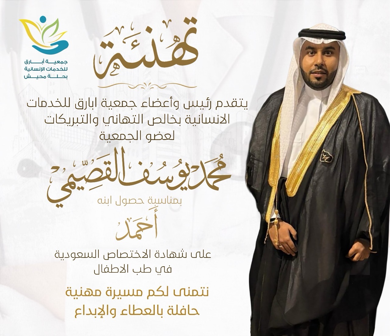 تهنئة جمعية أبارق بحصول أحمد القصيمي على شهادة الاختصاص السعودية