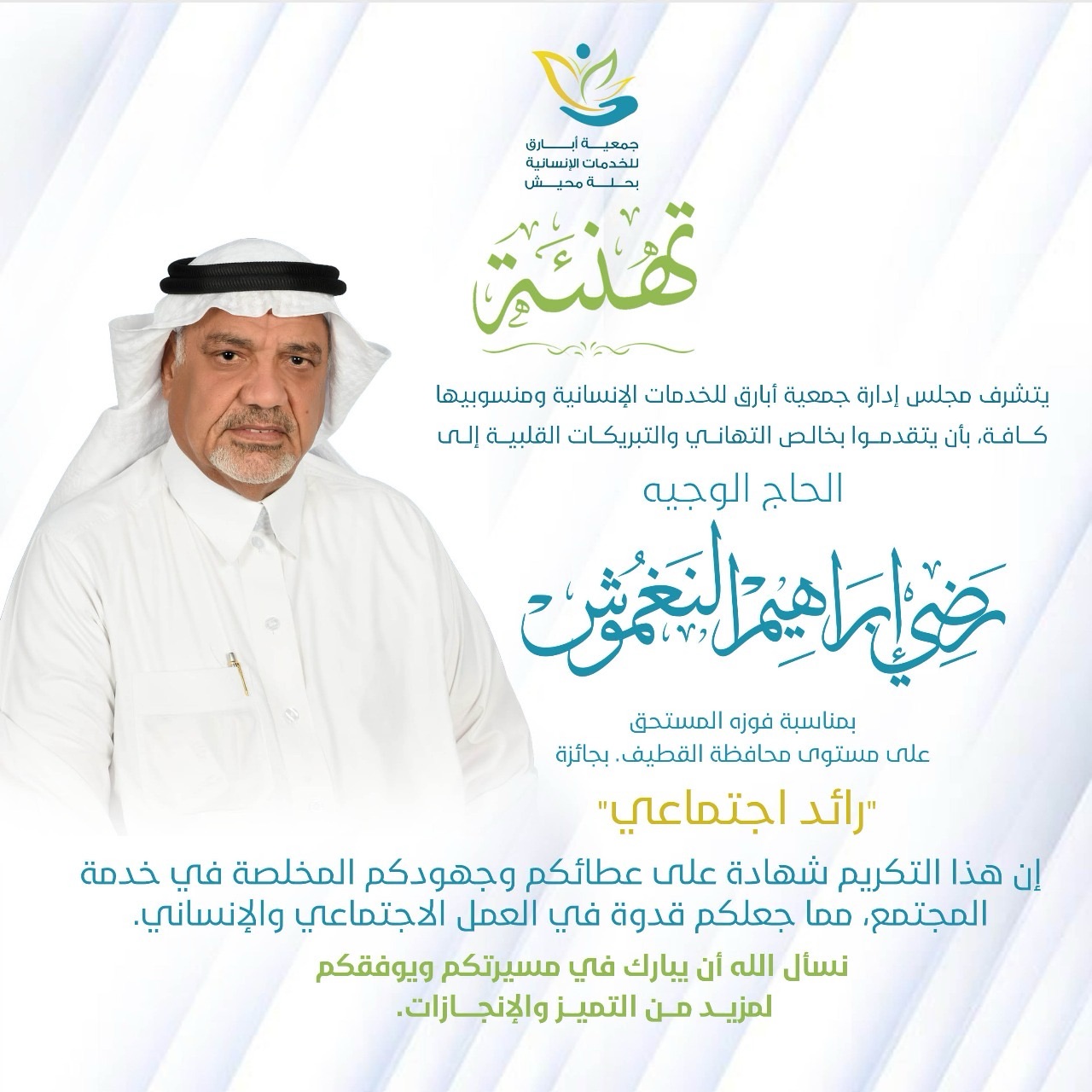 جمعية أبارق تُهنّئ الوجيه رضي إبراهيم النغموش بمناسبة نيله جائزة “رائد اجتماعي”