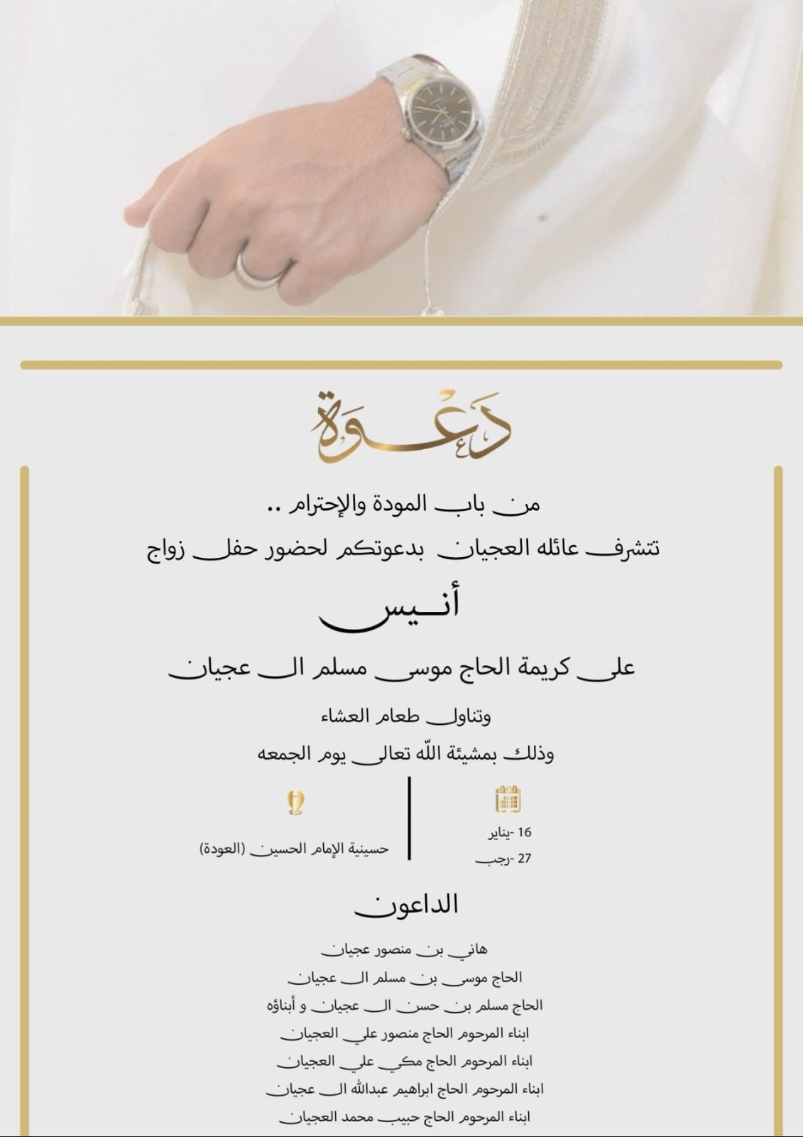 تتشرف عائلة العجيان بدعوتكم لحضور حفل زواج