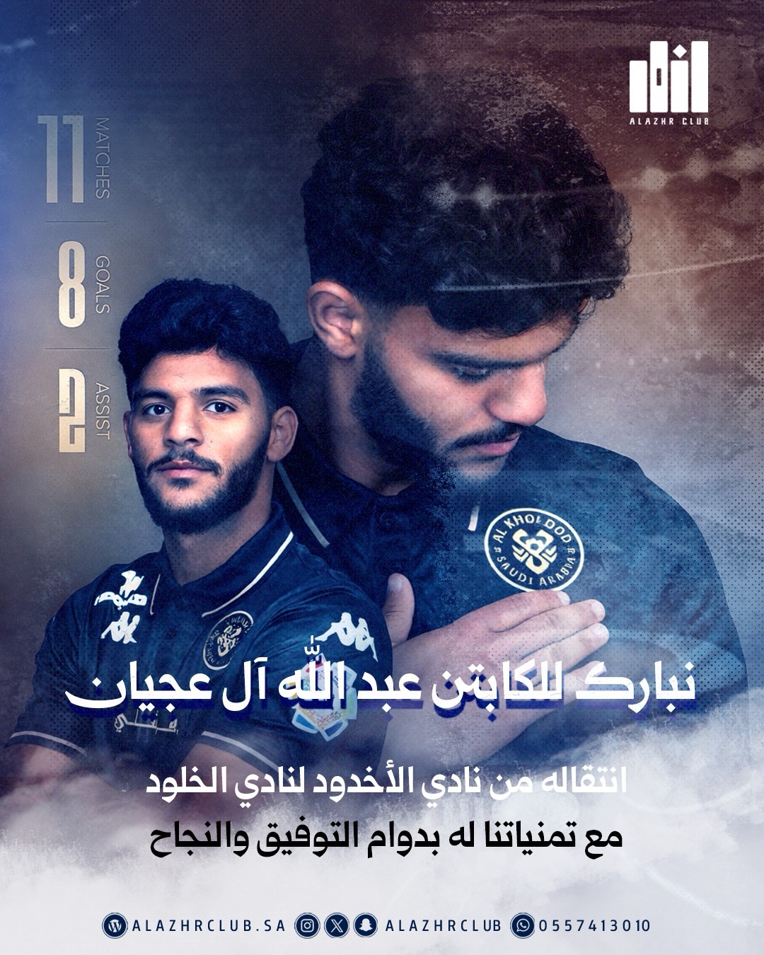 يتقدم نادي الأزهر الرياضي بأسمى آيات التهاني والتبريكات للاعب عبدالله آل عجيان بمناسبة انتقاله وتوقيعه أول عقد احترافي في مسيرته الرياضية، متمنين له دوام التوفيق والنجاح في خطوته الجديدة.