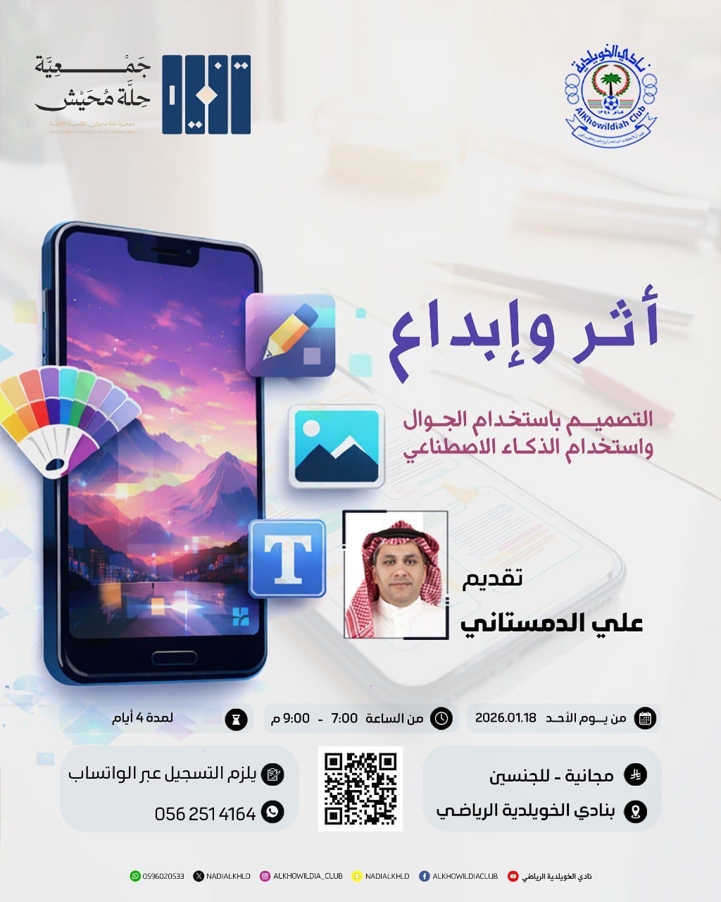 لأن الإبداع يبدأ من هاتفك ولأن الفرص تُصنع بلمسة ذكية ..يسر نادي الخويلدية بالتعاون مع جمعية حلة محيش للتنمية الأهلية دعوتكم للمشاركة في مبادرة أثر وإبداع