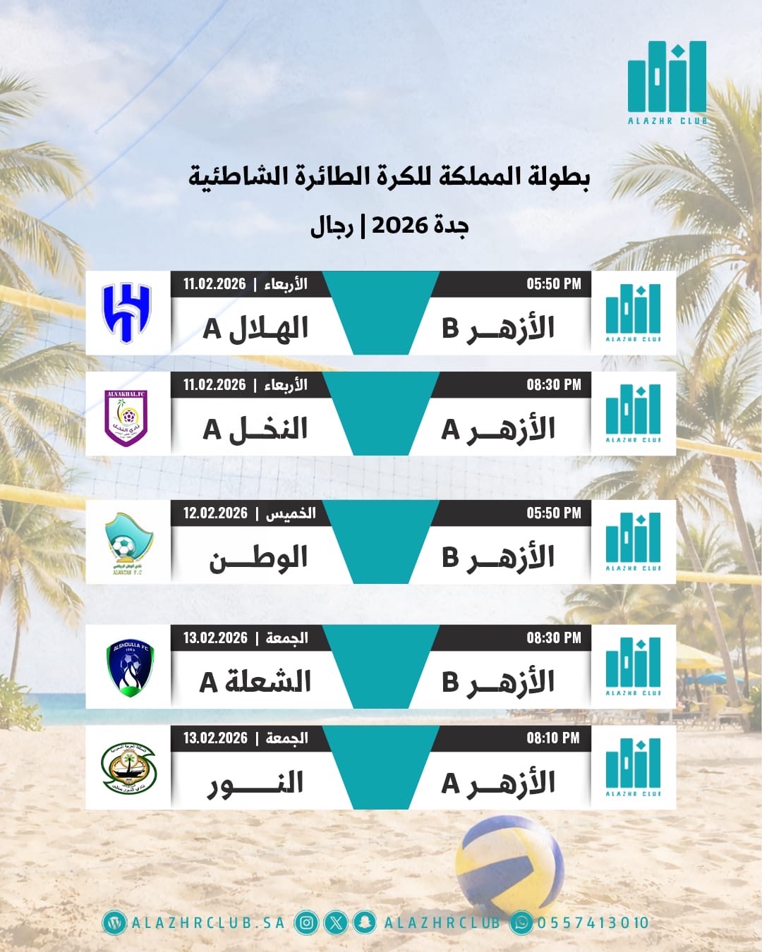 يخوض نادي الأزهر الرياضي تحديًا جديدًا ضمن منافسات بطولة المملكة للكرة الطائرة الشاطئية للرجال 2026، والتي تحتضنها مدينة جدة، في مشاركة تعكس تصاعد حضور النادي وطموحه المتنامي في البطولات الوطنية. ويمثل الأزهر في البطولة فريقان هما الأزهر (A) والأزهر (B)، يدخلان المنافسات وسط جدول مزدحم بالمواجهات القوية أمام نخبة من الفرق المشاركة، في اختبار حقيقي للجاهزية الفنية والبدنية.