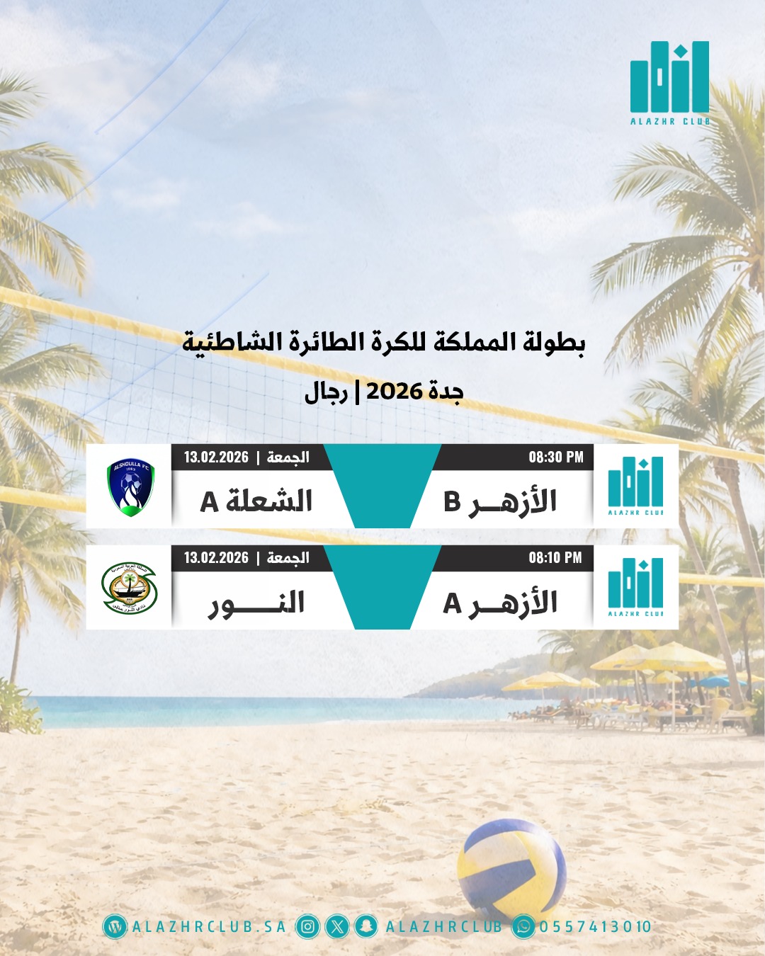 يخوض نادي الأزهر مساء الجمعة 13 فبراير 2026 مواجهتين مرتقبتين ضمن منافسات بطولة المملكة للكرة الطائرة الشاطئية (رجال) والمقامة في جدة، بمشاركة فريقين يمثلان النادي في هذا المحفل الوطني.