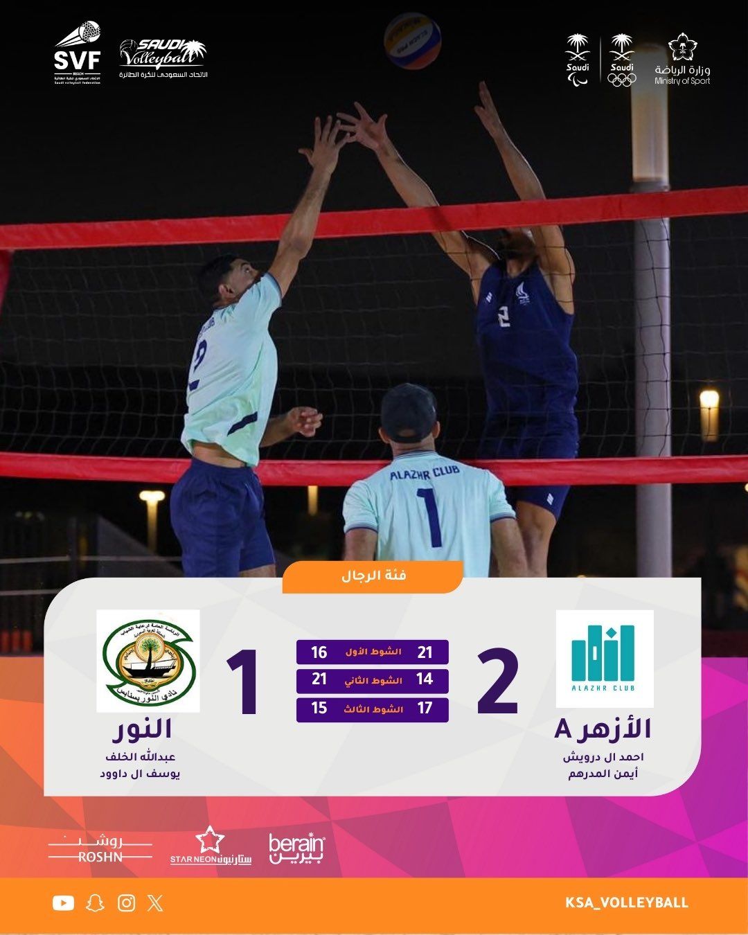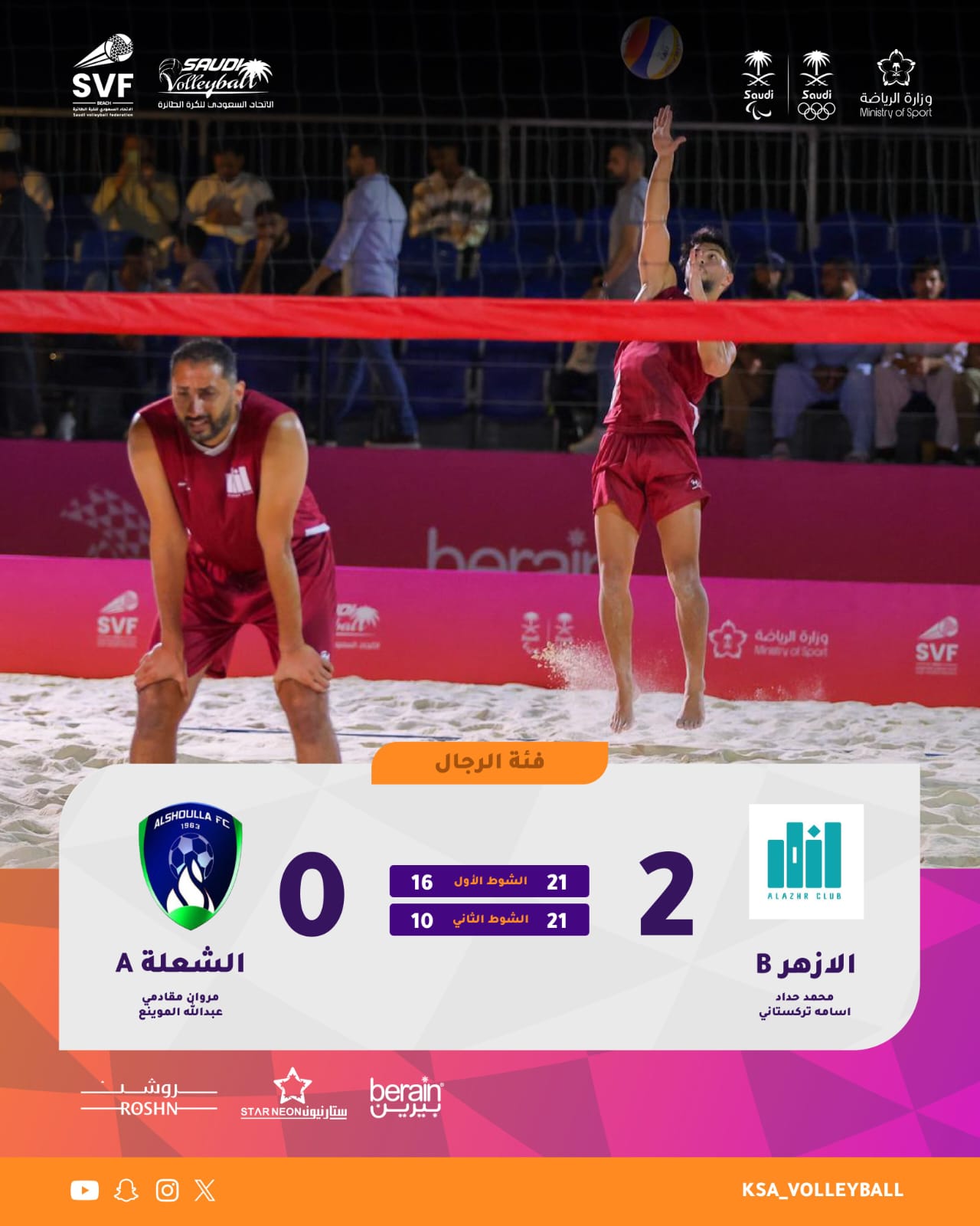 ففي المواجهة الأولى، حسم الأزهر B لقاءه أمام نادي الشعلة A بنتيجة شوطين دون مقابل (21-16، 21-10)، حيث قدّم الثنائي محمد حداد وأسامة تركستاني أداءً منضبطًا وقويًا، فرضا من خلاله إيقاعهما منذ البداية، مع تفوق واضح على مستوى الإرسال والاستقبال وإنهاء الكرات الحاسمة، ليؤكد الفريق أحقيته بالعبور بثقة إلى الأدوار الإقصائية.