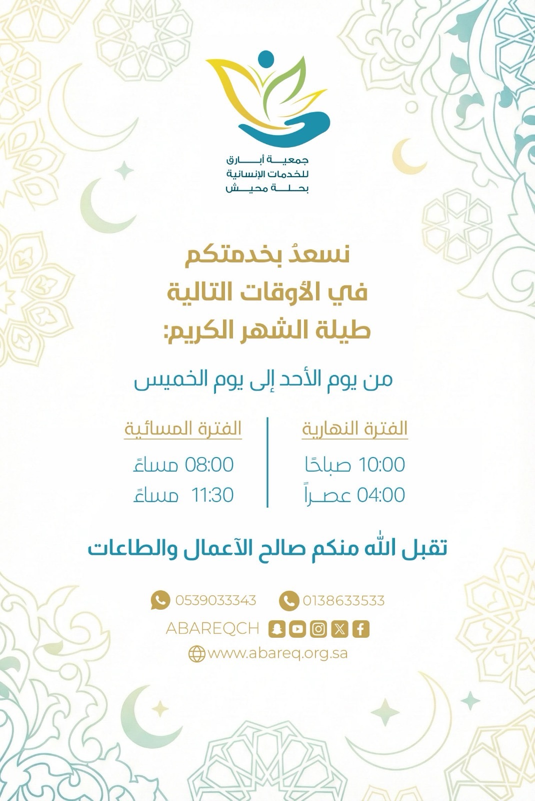 أوقات العمل بجمعية أبارق في شهر رمضان المبارك