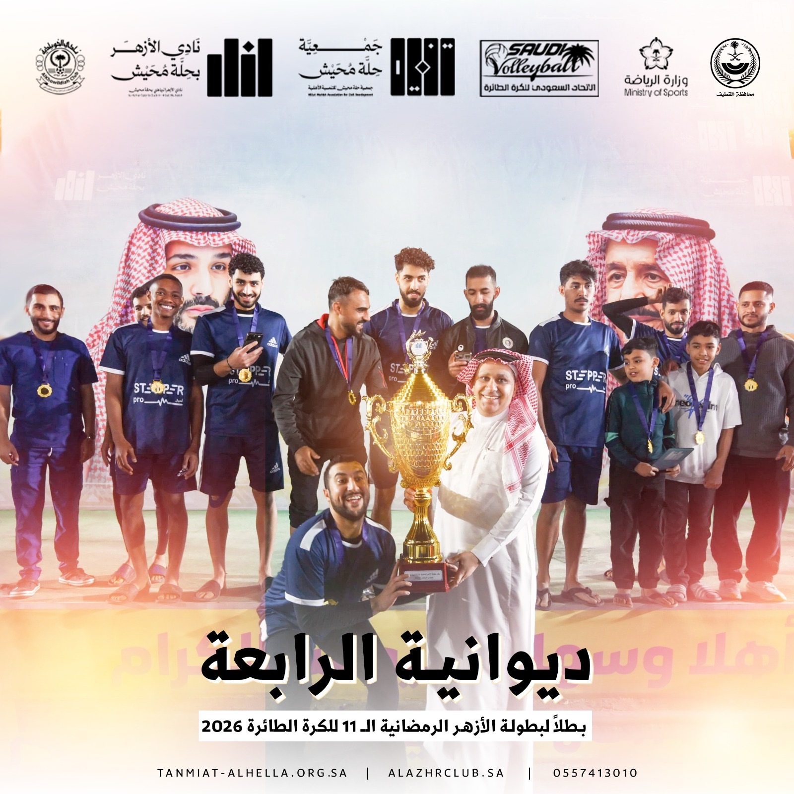 توج الدكتور علي الدمستاني رئيس نادي الأزهر وجمعية حلة محيش للتنمية الأهلية، فريق ديوانية الرابعة بطلاً لبطولة الأزهر الرمضانية الحادية عشرة للكرة الطائرة 2026، بعد فوزه على فريق مانغلور الهندي بنتيجة شوطين دون مقابل، في المباراة النهائية التي أقيمت مساء الثلاثاء على الملعب الرملي بمقر جمعية حلة محيش للتنمية الأهلية، تحت رعاية سعادة محافظ القطيف الأستاذ عبدالله بن علي السيف، وبمشاركة ستة فرق وزعت على مجموعتين، في نسخة جديدة أكدت استمرار نجاح البطولات الرياضية التي تحتضنها حلة محيش بالشراكة مع نادي الأزهر الرياضي.