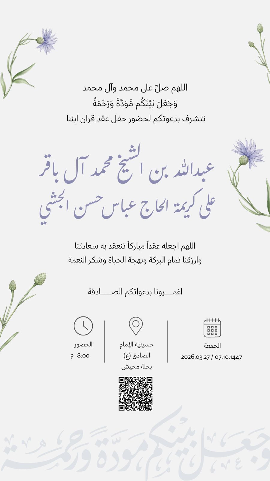 دعوة لعقد قران عبدالله بن الشيخ محمد آل باقر ليلة السبت حسينية الامام الصادق ع