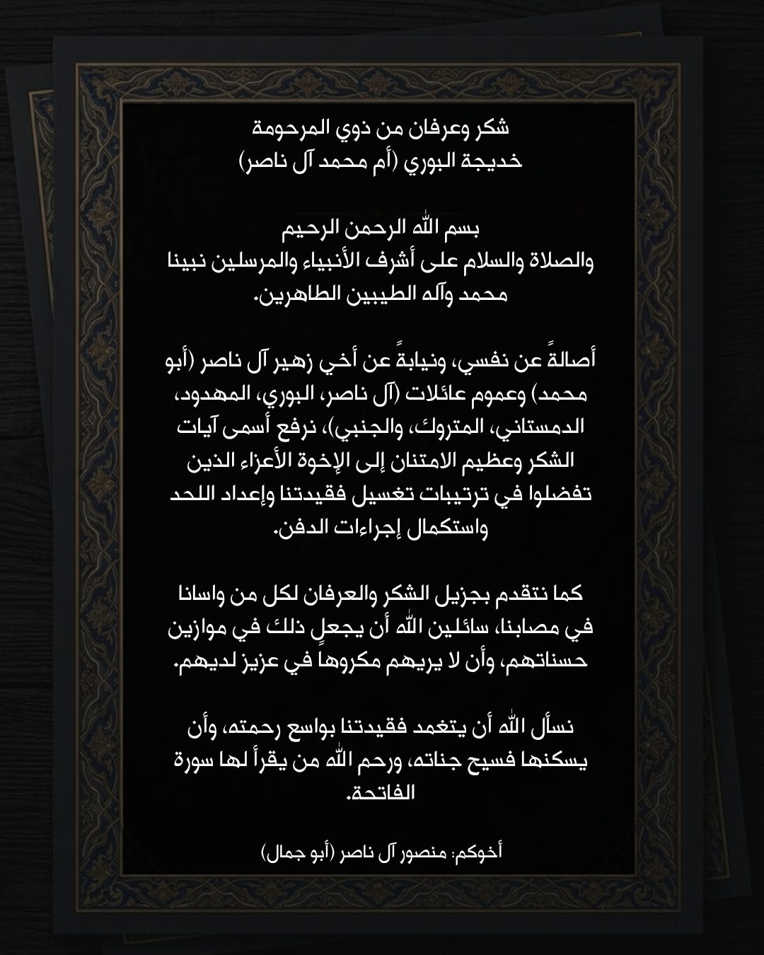 رسالة شكر وعرفان من ذوي المرحومة خديجة البوري (أم محمد آل ناصر)