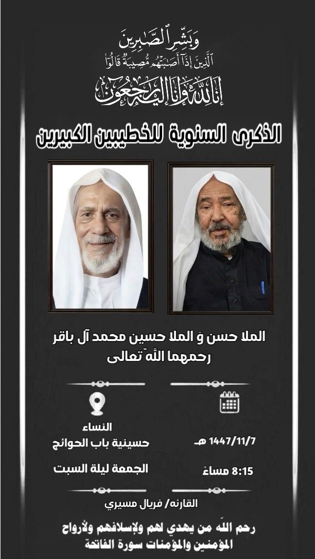 الرئيسية/دينية/للنساء: الذكرى السنوية للخطيبين الكبيرين الملا حسن والملا حسين آل باقر دينية للنساء: الذكرى السنوية للخطيبين الكبيرين الملا حسن والملا حسين آل باقر منذ ساعة واحدة 20 منذ ساعة واحدة 20